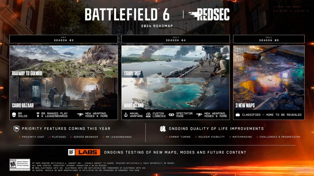EA’s roadmap shows Battlefield 6 is doubling down on huge maps. The upcoming Season 3, kicking off in May, will introduce Railway to Golmud, a rework of the classic Golmud Railway map from Battlefield 4. It’s almost four times bigger than Mirak Valley, which is already pretty massive. Alongside it, players will get a fresh take on Battlefield 3’s Grand Bazaar, now called Cairo Bazaar. These maps set the stage for sprawling battles, but they’re just the appetizer.